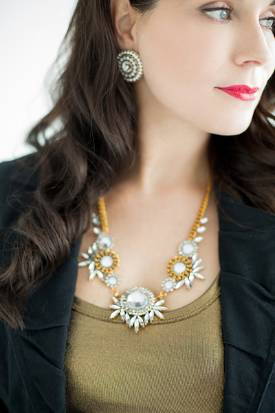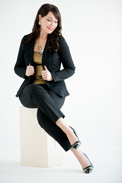 A black suit is a classic and will never go out of style. Although this jacket and bottom are not from the same company, they are however the same shade, fabric and texture making them a perfect fit. Speaking of perfect fit, remember the ‘dress for your body type’ rule. Just because a long boxy blazer is in these days doesn’t mean it’s meant for you. This fitted blazer drops just above the largest part of my thigh and cinches at the smallest part of my waist creating a flattering curve. Ankle hems and straight cut pants are great to feature a sleek shoe and give the illusion of a slimmer leg. Pair it with a gold metallic camisole to add shine to this conservative look. What perfect timing to rediscover these items as both are totally hot this season!